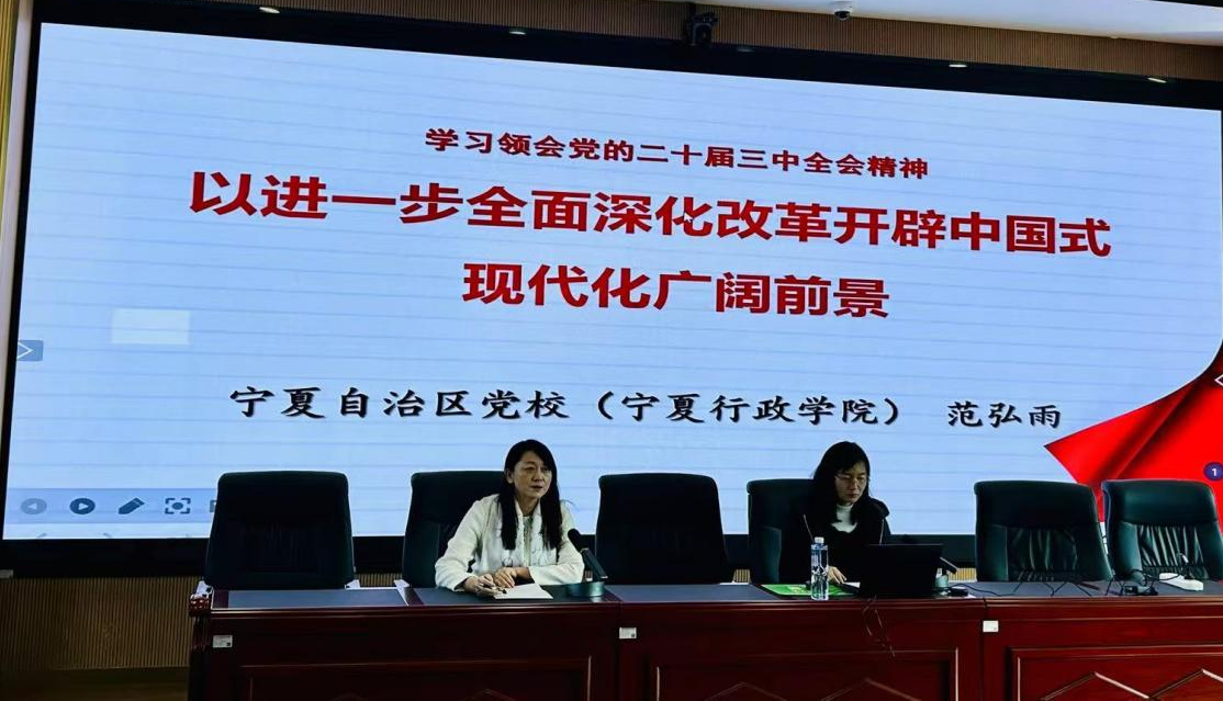 邀请中共宁夏回族自治区党校政治部的范弘雨博士为学院教职工作“学习领会党的二十届三中全会精神”专题辅导。学院全体教职工参加本次讲座,学院党总支书记朱海燕主持讲座。