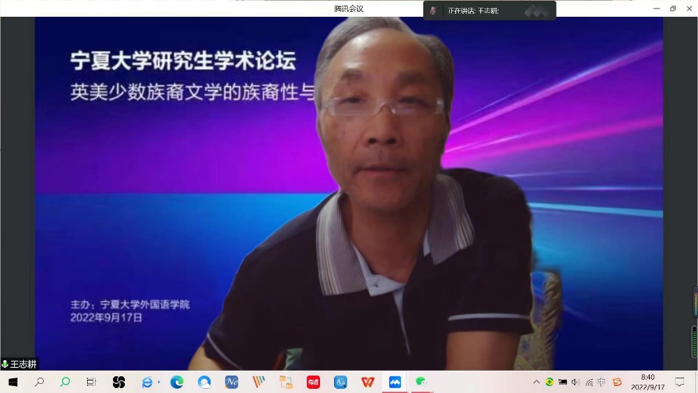 在主旨发言环节,首先,王志耕教授从宏观的角度对少数族裔文学研究进行了观点分享。他指出,少数族裔文学研究是比较文学视阈的一部分,需要对不同的文化体系进行比较。同时,以马克思主义理论为参照,在少数族裔文学研究过程中不能只是简单地站在后殖民理论的立场上看待少数族裔文学所反映的中心和边缘的对立关系。基于对民族与世界关系的理解,王志耕教授还提出了少数族裔文学研究应遵循的几点原则。