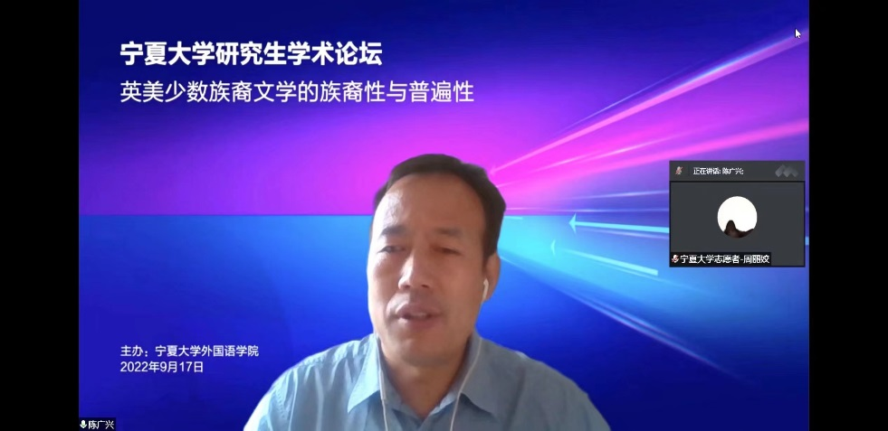 其次,陈广兴博士从微观的角度对少数族裔文学的特殊性进行了讲解,通过大量英美文学例证,印证了文学研究中族裔问题的重要性。陈广兴博士带领参会者对相关文本进行文本细读,通过文本细节的挖掘开拓了参会者的选题思路,增强了参会者对少数族裔文学研究的信心。