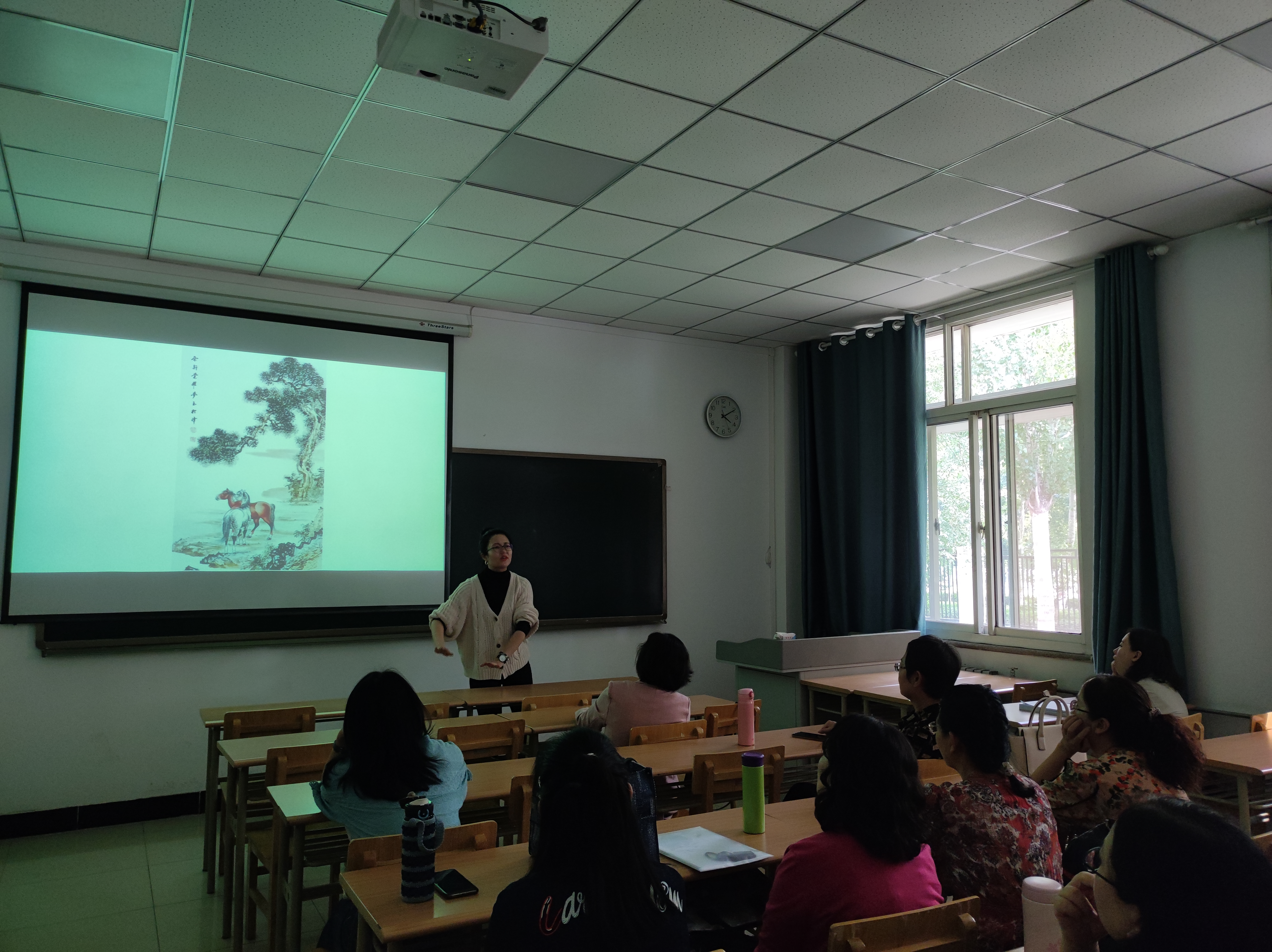 会上,胡又铭老师以自己在德国读博期间的亲身经历,首先向大家介绍了德国大学课堂的特点、教授的教学风格、学生自主学习能力的培养等方面的情况。之后,胡老师通过具体的文本实例,给大家详细阐述了为了学好弄懂文学课,学生需要在课前做什么样的准备、如何进行独立探索以获取与课本相关的背景知识等问题。通过具体的案例分析,胡老师指出了中西方学习者的思维习惯和差异,提出:为了使学生更好地了解文学作品的内涵以及字里行间的寓意,我们的老师需要在挖掘学生的潜力方面下工夫,引导他们发挥自己的主观能动性,进行探究式学习、自主式学习,而不是一味对他们进行知识的生硬灌输。胡老师的讲座生动、有趣,引起了在座老师的极大兴趣。大家纷纷围绕着自己的教学体会和感悟进行了分享和探讨。