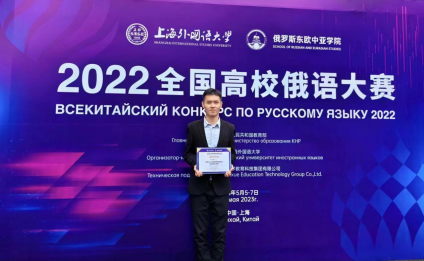 俄语专业2019级李东泰同学与全国高校高年级组的22名同学同台竞技,过关斩将,最终荣获三等奖,获得国家留学基金委资助赴俄罗斯攻读硕士学位资格。