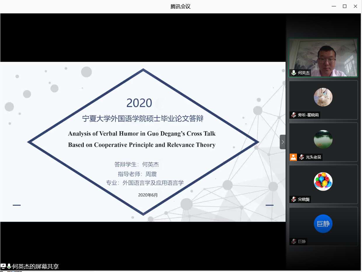 顺利精心组织并顺利完成了2020届硕士研究生的线上论文答辩工作。其中,英语语言文学、外国语言学及应用语言学、口译、笔译和学科教学(英语)专业共56名同学,分别于6月1日、6月2日、6月4日、6月5日共分为8组,以邀请的校外专家老师、校内专家导师作为评委组,有序顺利地进行了线上答辩。