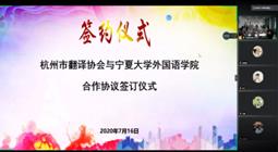 与杭州市翻译协会合作协议签订”仪式上,牵线搭桥人上海外语教育出版社西北大区经理苏云先生通过线上的方式,向学院的参会人员把双方领导和老师进行了一个介绍。本次签约主要是本着进一步培养学生翻译实践应用能力,更好地为学校和自治区的国际学术交流和国际交往做好服务,经杭州翻译协会与成人抖阴