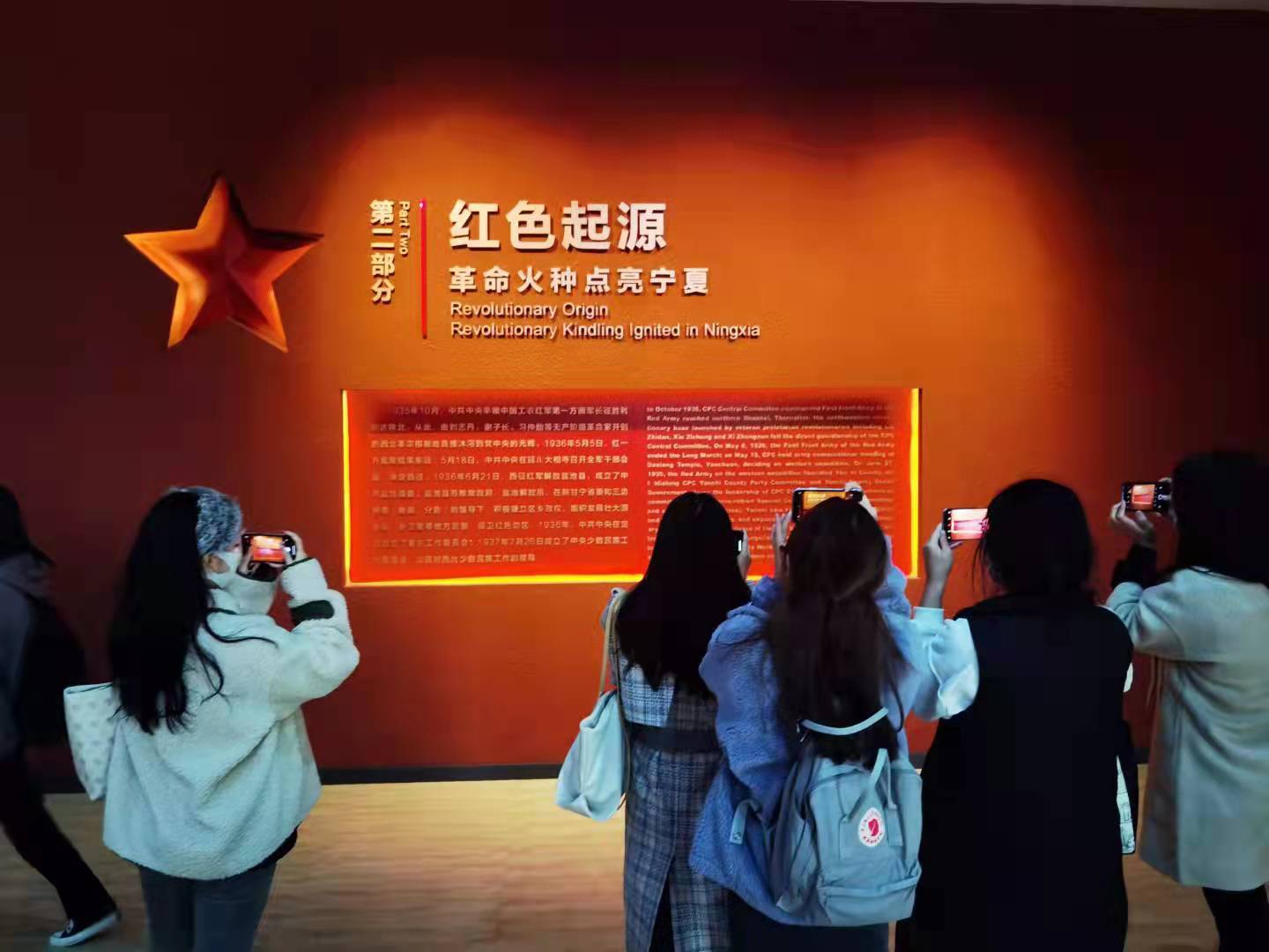 团队一行首先到达盐池县革命纪念馆,在讲解员的带领下,大家了解了盐池县在陕甘宁革命老区中发挥的重要作用,也对馆内标志牌、展品牌进行拍摄,共同探讨标识语的英文翻译版本。大家在聆听讲解的同时,也注意观察标示牌上不同历史事件的文字介绍和英文翻译,发现了其中许多英文翻译仍存在需要改进的地方,这次活动使得大家在革命精神的熏陶中加深了对生活实际语境中的翻译的认识。