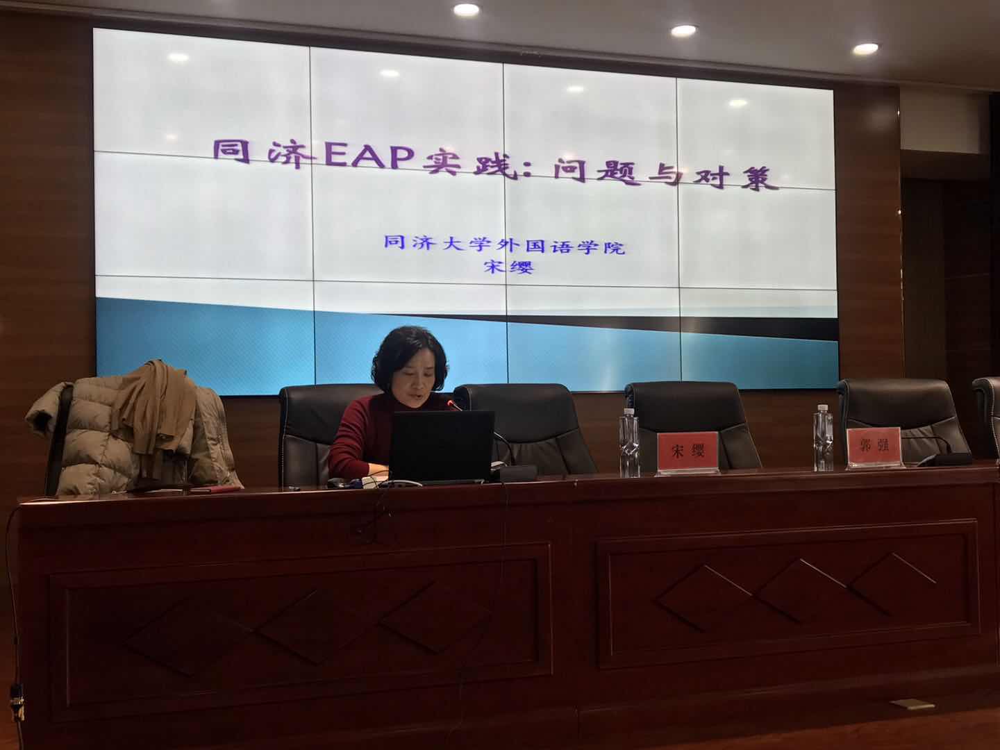 403报告厅做了题为“同济EAP实践:问题与对策”的报告。在报告中,宋缨副院长介绍了近五年间同济大学以学术英语为导向的本硕博一体化公共英语课程体系改革的建设情况,梳理了实践中出现的典型问题,并扼要地说明了相应的对策。与此同时,重点论证了专门学术英语(ESAP)和专业全英语课程之间的区别和联系,以同济大学开设的“学术英语(医学)”课程为案例,从大学英语教师角度,介绍了同济大学公英部在教学定位、重心、方法等几个方面的具体做法。发言引起了参会教师的好评和对大学英语教学改革的兴趣。
