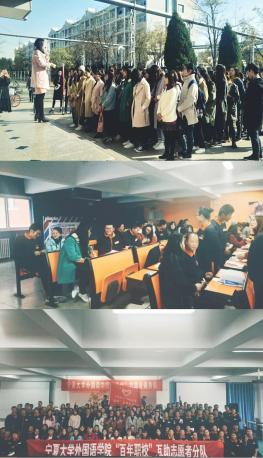 立足专业,先后开展了形式多样、内容丰富、面向全区、全校的志愿服务活动,形成了“语伴”志愿者小分队服务模式。其中,以英语角、英语读书交流、大学英语四六级帮扶为主的“成才小分队”已成为校内被普遍认可的英语学习交流平台;以银川“百年职校”英语教学志愿活动为主的“成长小分队”也在2017年4月开花结果,不仅在双方学校反响热烈,更得到了自治区团委宁夏青少年发展基金会的关注和支持。