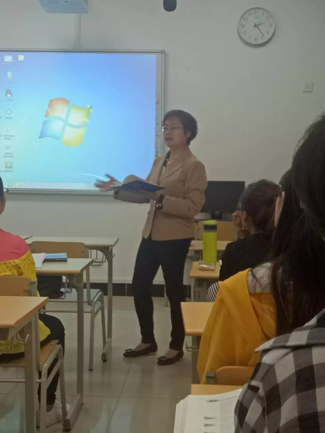 吴蓉老师所带的2015级英语专业《教学法》课程微格教学活动。在两节课的教学中,吴蓉老师安排了班里3名2015级本科生进行了微格教学的讲课实践。三个同学分别就初中英语里的课程内容以及阅读技巧进行了真实的课堂展示。从讲课环节来看,每个学生都能够按照任课教师所传授的教学法的知识以及课堂规范的要求,进行实践操作,讲课风格各具特色,但每个人也都有各自的不足和缺点。每个学生讲完,吴蓉老师都进行点评,并从教学法的角度给同学们提出中肯的建议,使同学们在进行教学实践的同时又补充了相应的理论知识。郭鸿雁教授对每个同学的讲课进行了耐心细致的点评,每个点评都风趣幽默,引来同学们的阵阵掌声和笑声,听得同学们频频点头。郭老师希望同学们在今后的学习中注重加强语言基本功的训练和教学方法的研究,为毕业后成为一名合格的教师做好充分的准备。