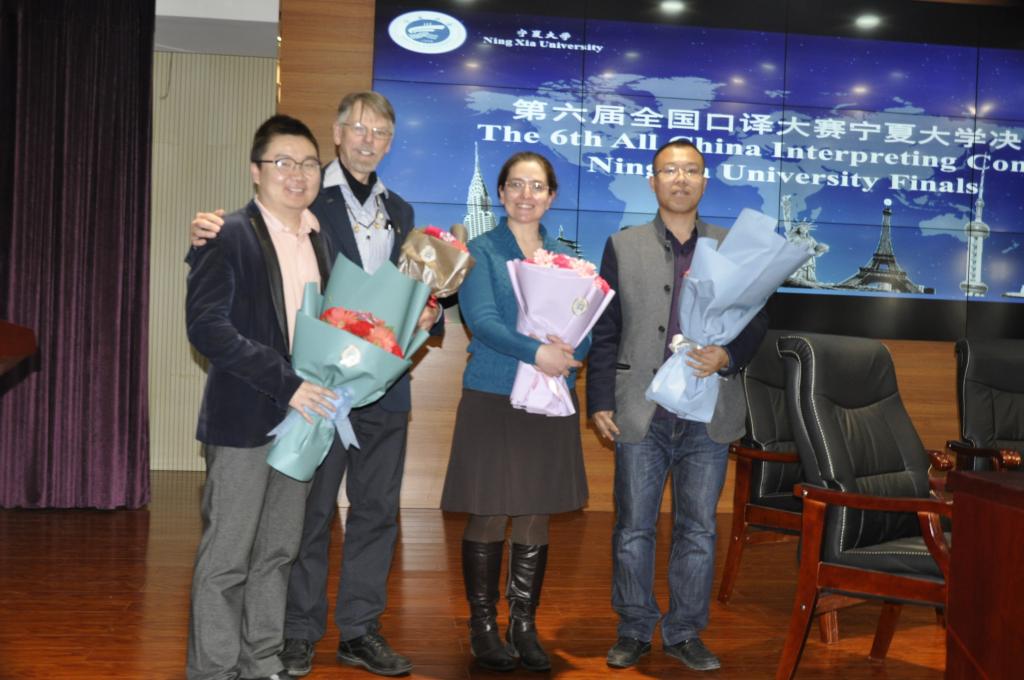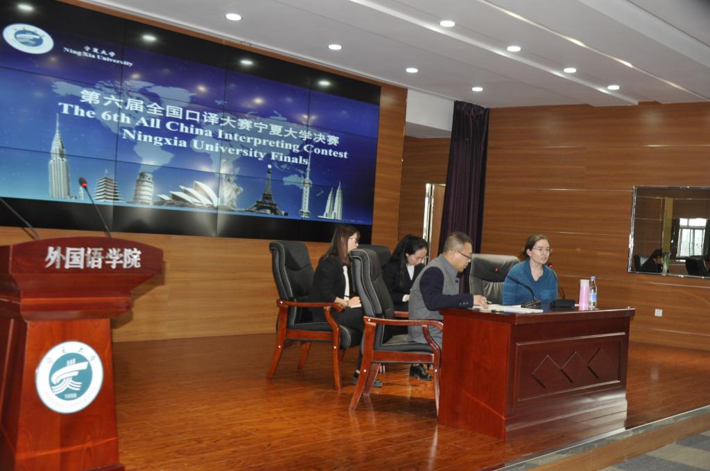 本次大赛设置了三个环节:“英译汉交替传译”、“汉译英交替传译”和“现场访谈互译”。赛题内容涵盖时下经济、科技、文化等领域热点话题,全面考察了各位学生译员的理解、表达能力以及心理素质。为保证比赛的真实性和即时性,大赛特邀中外嘉宾现场座谈,来自美国的富布莱特专家Professor Munday和外院同传教师孔明就“美国华人”话题展开讨论,两位译员从旁翻译,完美胜任嘉宾座谈中的各种数字、专业术语和信息内容的传达;第二组访谈嘉宾美国外教Carolyn Stent老师和王建刚老师就社交媒体的发展和使用展开激烈讨论,两位译员沉着应对,展现了较强的口译综合素养。本次比赛紧张激烈,却也不失活泼,主持人在工作人员计分间隙,以轻松愉快的采访形式邀请了毕业于国内外口译名校和熟悉宁夏口译市场,有着丰富口译实战经验的评委老师和嘉宾分享了他们的口译学习经历和宝贵经验。