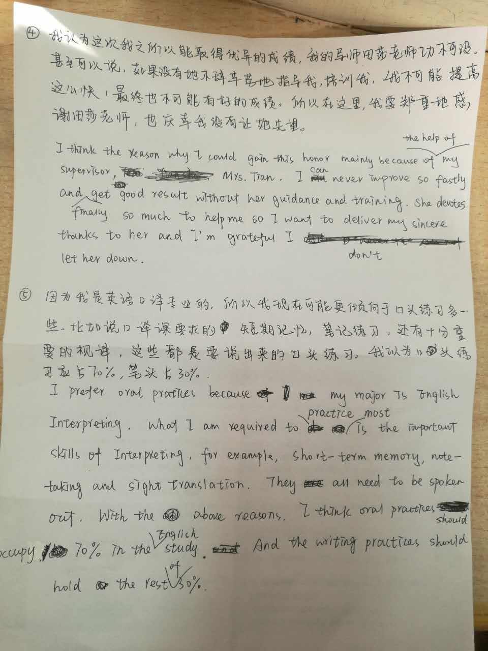 是的,我必须感谢我的老师。她帮了我很多。她总是用业余时间教我们如何写作。在这两个星期,我写了许多文章,我的老师杨老师非常有耐心地仔细阅读和纠正我的文章。因为她,我提高了我自己。