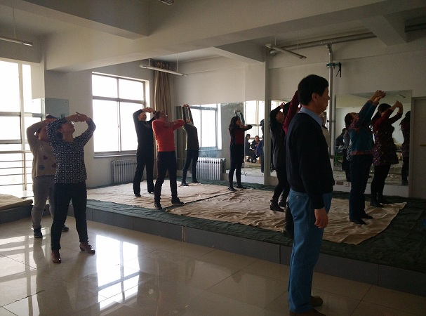 瞧,在“家”的东面,十几位教师已在代玉霞老师的带领下,一呼一吸、拉伸放松地练起了“八段锦”这一中国传统的健身术。