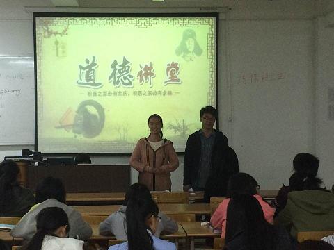 道德讲堂活动在学院213教室举行。本次活动由学生会安全心理部,外联部主办,2014级英语专业全体同学参加了本次活动。