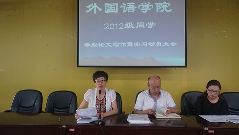 面向2012级学生本科毕业论文以及毕业实习工作已提早全面铺开,7月10日,学院在403教室举行2012级学生毕业论文暨实习动员大会,为准毕业生们就毕业年最关心的事情——写论文和实习找工作进行了指导。外国学院副院长李文军老师、英语系主任马菊玲老师、副主任刘燕老师以及全体论文、实习指导教师与2012级全体学生参加了会议。