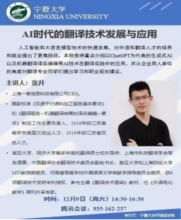 邀请上海一者信息科技有限公司CEO张井老师为学院翻译方向学生做了题为“AI时代的翻译技术发展与应用”的线上讲座。张井老师是国标《双语平行语料加工服务基本要求》制定工作的主要负责人,同时也是复旦大学、同济大学等多所高校的翻译硕士校外导师。