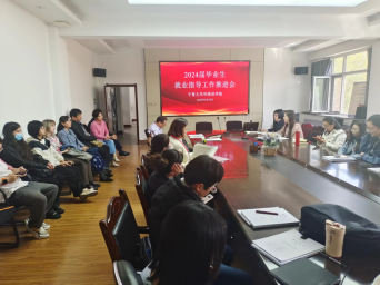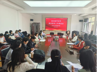 2024届毕业生就业指导工作推进会在逸夫楼二楼会议室召开。参加会议的人员有学院党总支书记朱海燕、副书记胡笑瑛、副院长金忠杰、学院工作组核心成员、各毕业班班主任及精准指导教师。