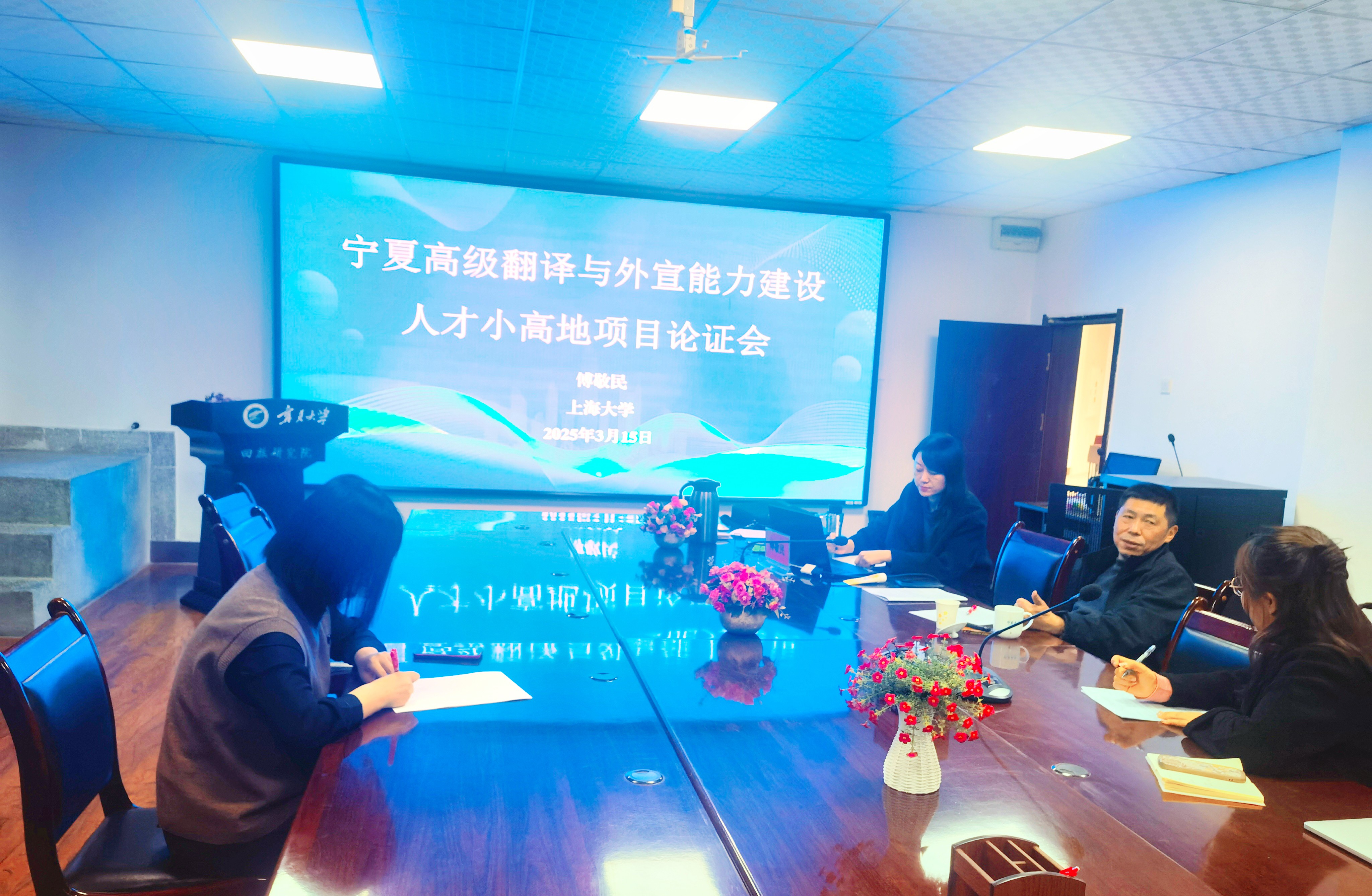 召开“宁夏高级翻译与外宣能力建设人才小高地项目论证会”,特邀国内应用翻译研究领域知名专家傅敬民教授现场指导。团队相关教师参加了论证会。论证会由人才小高地负责人朱海燕主持。