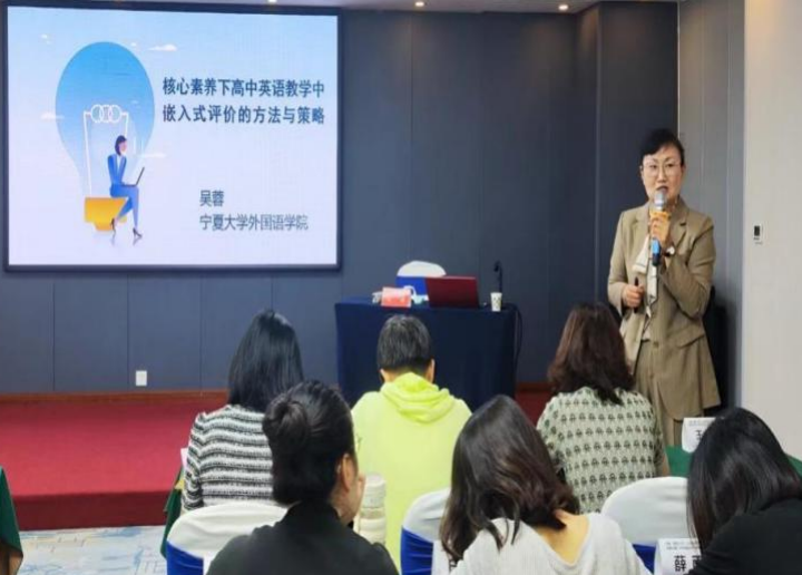 吴蓉教授和宋晓龑副教授受邀为学员做专题讲座。吴蓉老师以《核心素养背景下高中英语教学嵌入式评价的方法与策略》为题,通过实例概述了核心素养和教学评一体化的概念及特征, 随后从诊断性评价、形成性评价、终结性评价的大体系入手,结合高中英语教材介绍了嵌入式评价的方法和策略,最后分享了相关图书和活动评价量表。