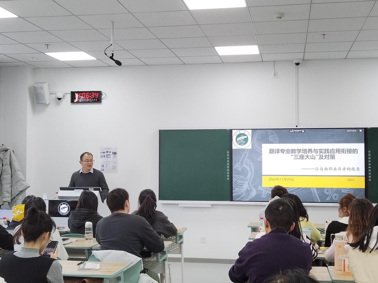 11月29日下午,翻译行业的资深专家蒋林老师应邀为成人抖阴 师生开展题为“翻译专业教学培养与实践应用衔接的‘三座大山’及对策 ——一位自由职业译者的视角”的主题讲座。本次讲座由刁俊副教授主持,成人抖阴 全体翻译硕士及部分教师参加讲座。