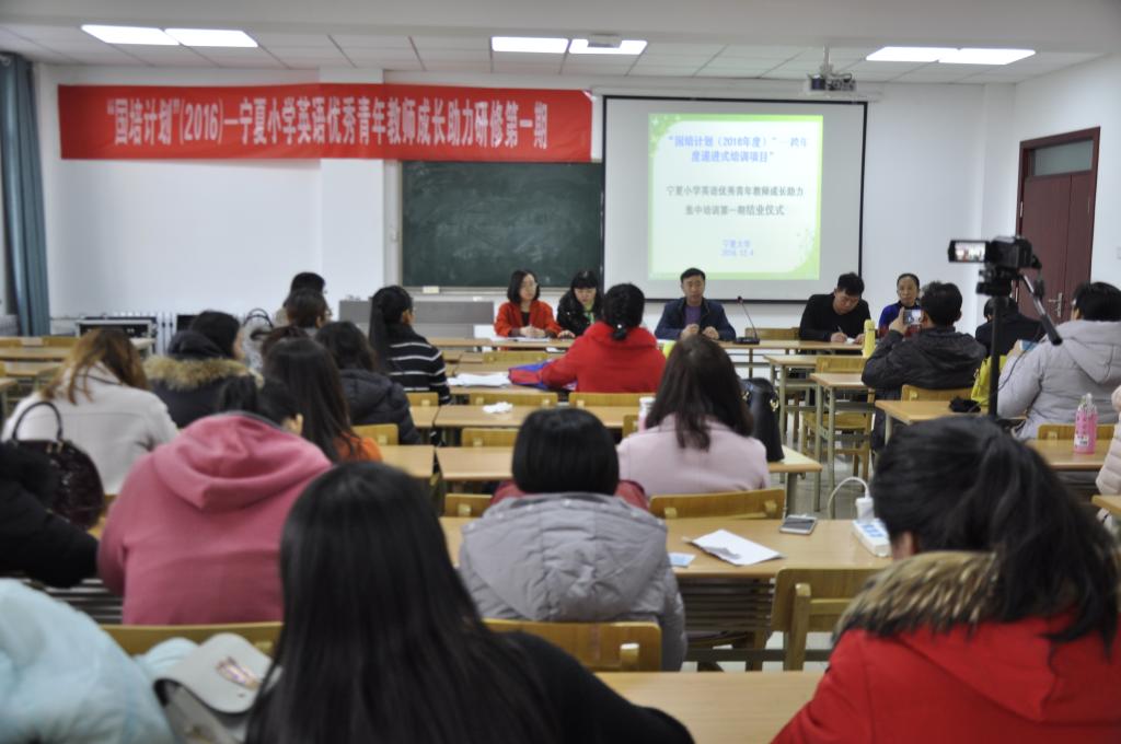 在外语楼213教室举行了“国培计划”(2016年度)宁夏小学英语优秀青年教师成长助力研修第一期集中培训的结业仪式,给为期8天的培训工作划上了圆满的句号。